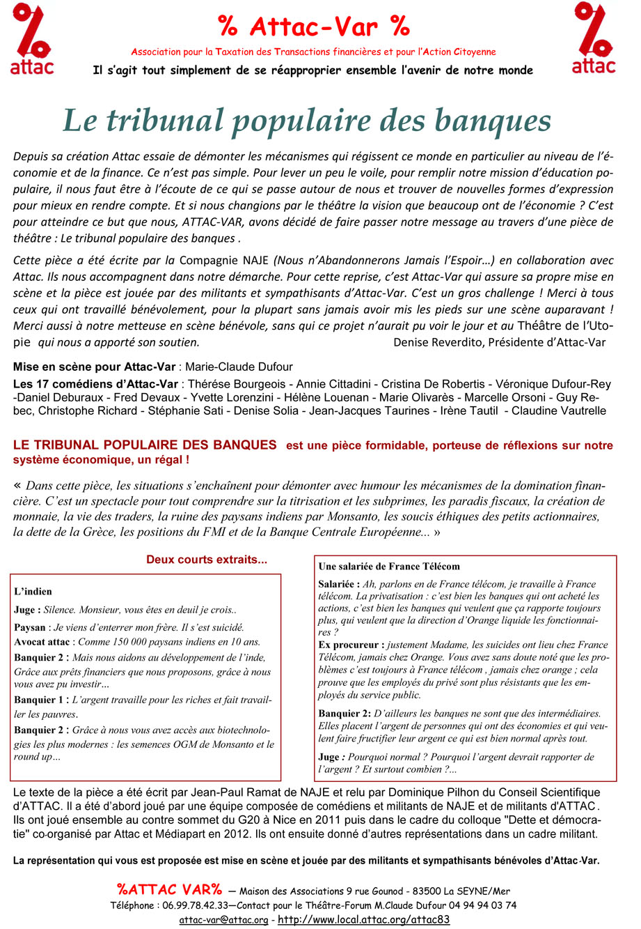 Attac Var a remonté le Tribunal populaire des banques de NAJE 25 janvier 2014 Actus Ce n’est pas le premier groupe d’attac qui remonte notre spectacle mais ce sont les derniers en date. leur première est dans un mois. Bravo à eux.