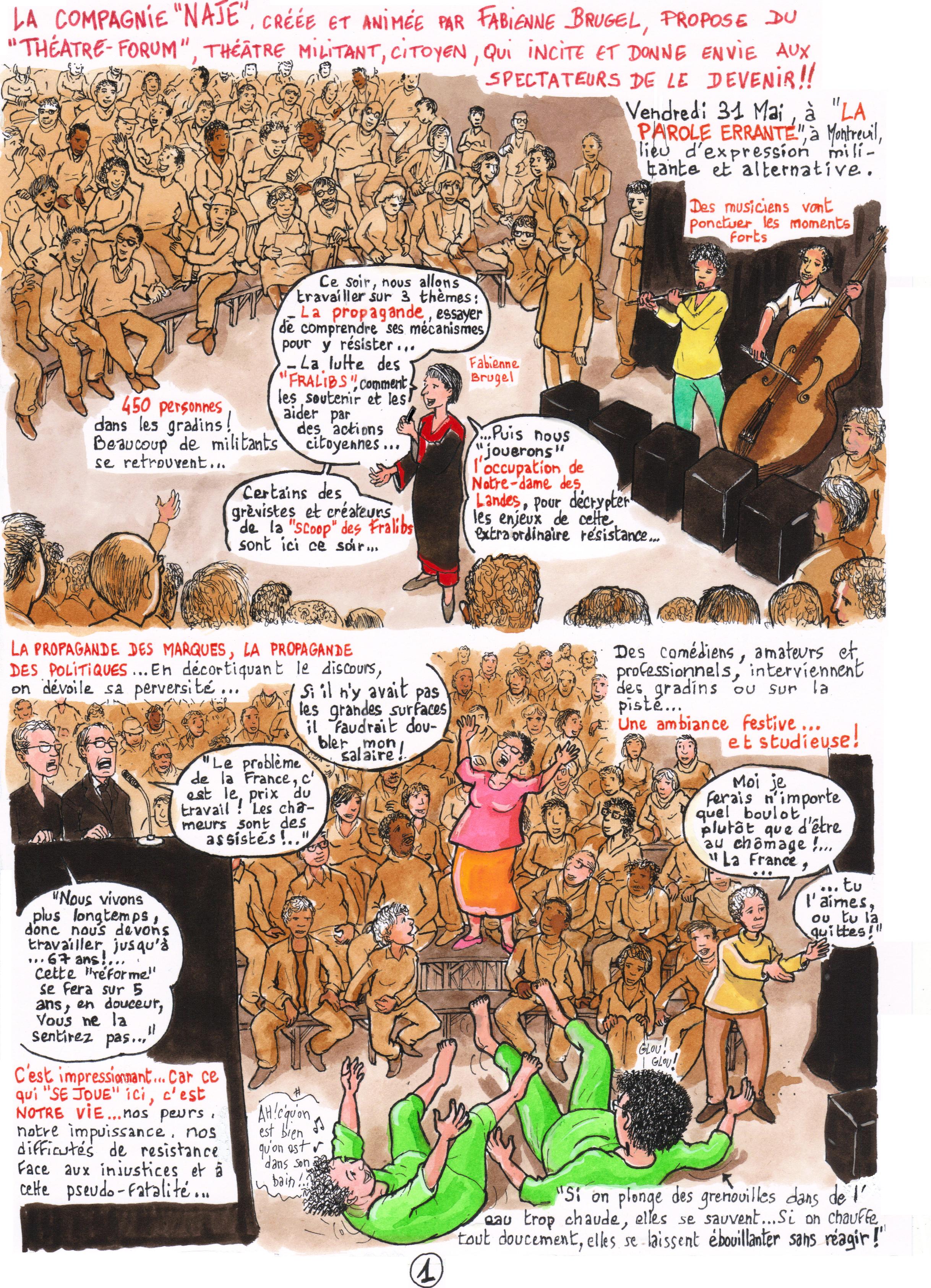 Lionel Brouck, qui a vu le spectacle « Les Bâtisseurs » le vendredi 31 mai à Montreuil, a créé une bande dessinée sur la soirée et nous l’a envoyée. Nous publions ici les planches de cette BD. Merci Lionel…