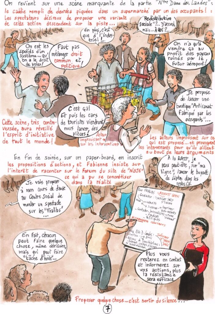 2) Parmi les moments forts du spectacle, il y a ceux où les contradictions au sein des « dépossédés » sont surmontées grâce à l’approche festive (par exemple, l’histoire du partage du petit déjeuner). C’est aussi l’un des points clefs de la stratégie de « Rules for radicals ». Si j’avais été présent, j’aurais proposé non seulement de donner plus de force à ces moments, mais de les placer vers la fin afin de montrer qu’une des clefs de la résistance créative, c’est de commencer à faire vivre le plus possible dans le présent les lendemains que l’on souhaite voir chanter. C’est l’approche que nous tentons au sein de l’archipel citoyen : « Osons les Jours heureux » qui reprend le beau titre du programme du Conseil national de la résistance. Le bien-vivre en acte est alors tout à la fois un moyen de résistance créative (R), d’expérimentation anticipatrice (E) et de Vision transformatrice (V) qui débloque l’imaginaire et montre la voie d’un autre monde possible. Si l’on y ajoute le E de l’évaluation démocratique et le R de la résistance refondatrice dans des situations d’effondrement provoquées par l’irresponsabilité écologique, sociale et financière du système dominant, cela nous permet de REVER, mais en acte, et de construire des alternatives aux logiques cauchemardesques que nous avons souvent à affronter. C’est aussi ce que nous recherchons avec ce que nous avons appelé la cellule de recherche-action NANOUB (pour « Nous Allons NOUs faire du Bien » !) qui est « une île flottante » au cœur de cet archipel, destinée à servir de lieu de ressource à la fois au sens de repos, de reconstitution de force de vie mais aussi de sources d’outils et d’imagination créatrice pour la cinquantaine de mouvements qui se retrouvent de près ou de loin au sein de cet archipel.