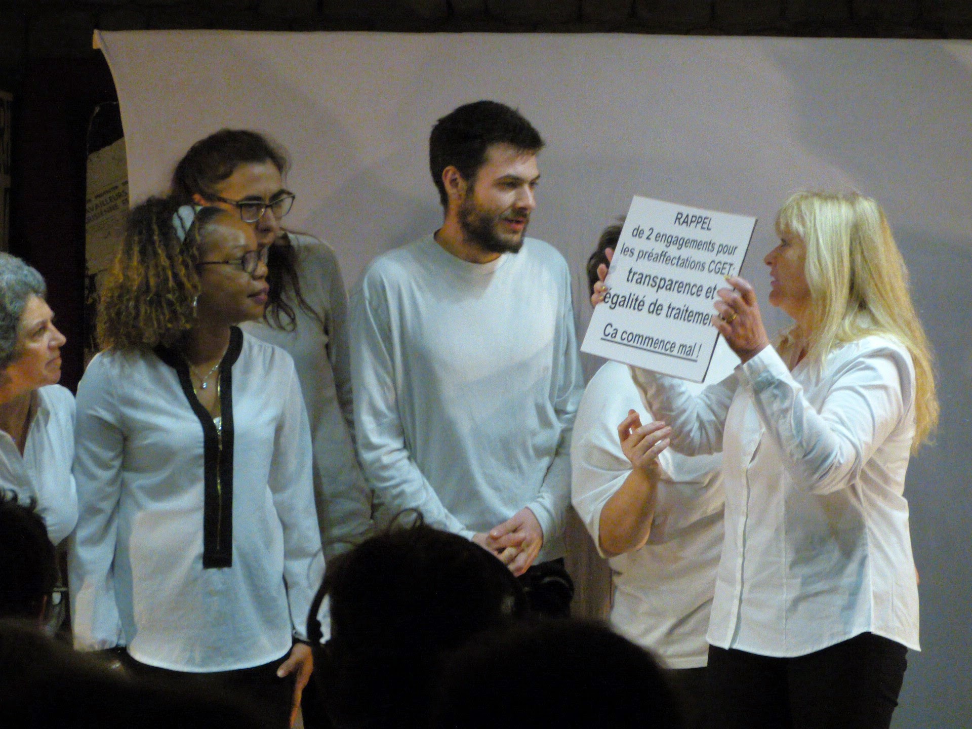 L’Acsé (ex-Fasild) est fusionnée avec l’ex-DIV et la Datar pour donner le CGET (Commissariat général à l’égalité des territoires). Notre spectacle a été écrit par Naje à partir des récits des salariées sur ce qu’elles ont vécu au FAS puis au Fasild puis à l’Acsé, ce qu’elles ont produit avec leur structure comme transformations de notre société (par exemple, l’accès à des places de cimetières tournées vers La Mecque pour que les migrants musulmans puissent enterrer leurs enfants et parents sur notre terre, le concept de discrimination raciale, les recherches qui ont fait avancer, les films qui ont diffusé des images de la diversité, etc.) et ce dont elles peuvent être fières. Il traitait aussi des conditions dans lesquelles s’est passée la dernière restructuration afin de s’entraîner en forum à agir plus efficacement et plus collectivement lors de la prochaine restructuration (qui ne manquera pas de leur arriver d’ici moins d’un an !).